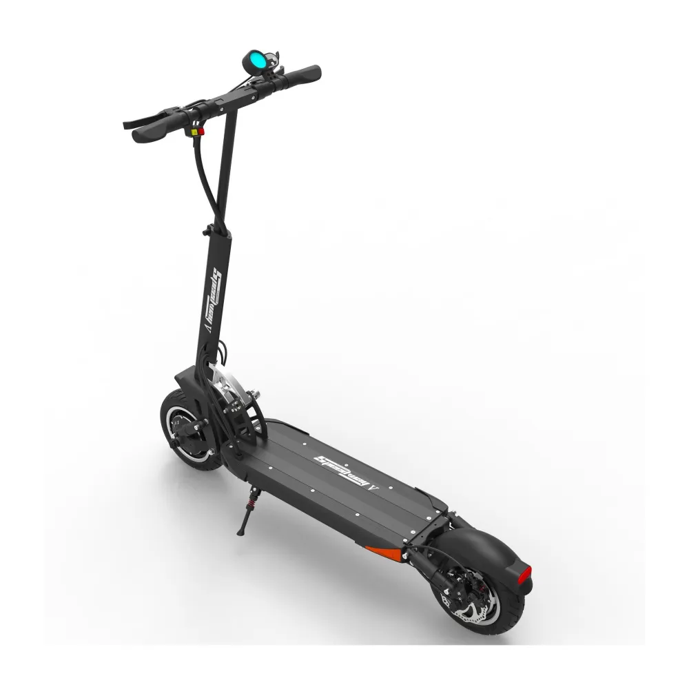Speedway 5 имеет регулируемый руль, который при разборке электросамоката складываеться вдоль стойки. Стоит прижать рулевую стойку к деке, размер агрегата уменьшиться в двое. На деке впереди и сзади светодиодные элементы позволяющие передвигаться ночью. Информационный дисплей покажет количество зарядки и скорость электросамоката Speedway 5