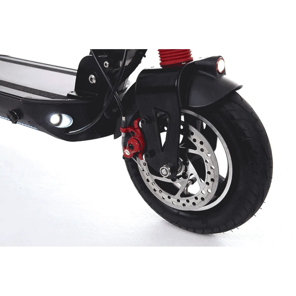 Электросамокат Starway Zero T10 имеет амортизаторы на переднем и заднем колесах. Это обеспечивает плавность хода. 10 дюймовые колеса делают агрегат более проходимым. Управлять транспортом помогает двойная тормозная система. Контролировать скорость можно на электронном дисплее, расположенном на руле. Там же отражается уровень заряда аккумулятора. Внешнее световое освещение состоит из передних LED фар, стоп-сигналов сзади, светодиодной подсветки деки и рулевой стойки.