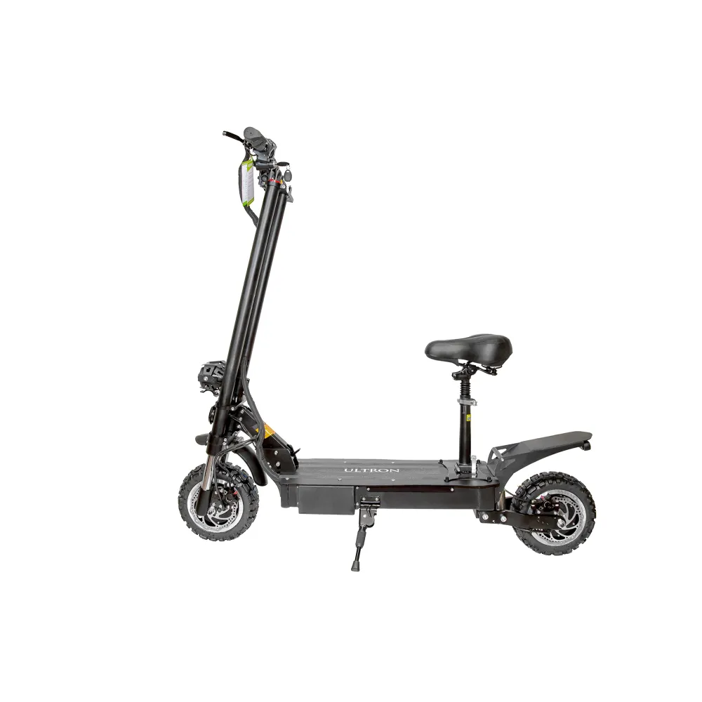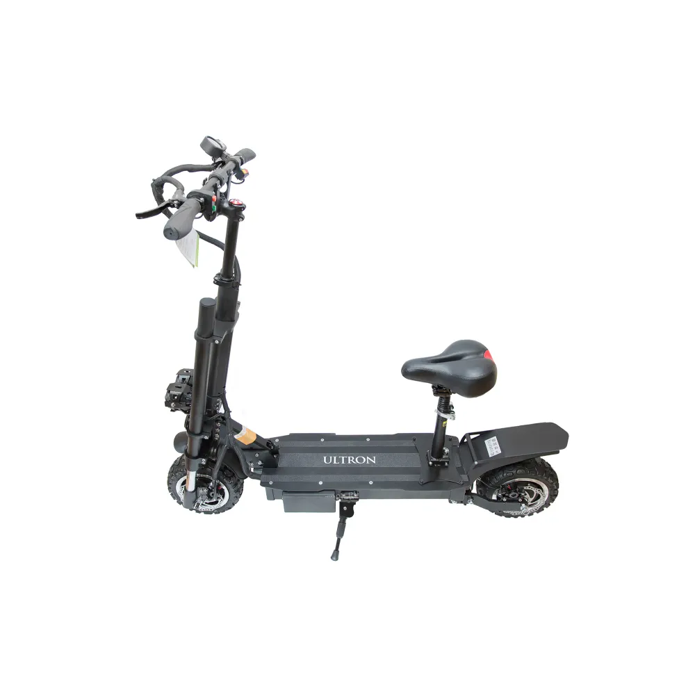 ULTRON T118 имеет 11 дюймовые широкие колеса, для большей устойчивости. Электросамокат оборудован съемным, амортизированным сидением. Оно понадобится в дальних поездках. Благодаря большой емкости аккумулятора 35 А*ч, транспорт может проехать на одном заряде до 95 км пути.