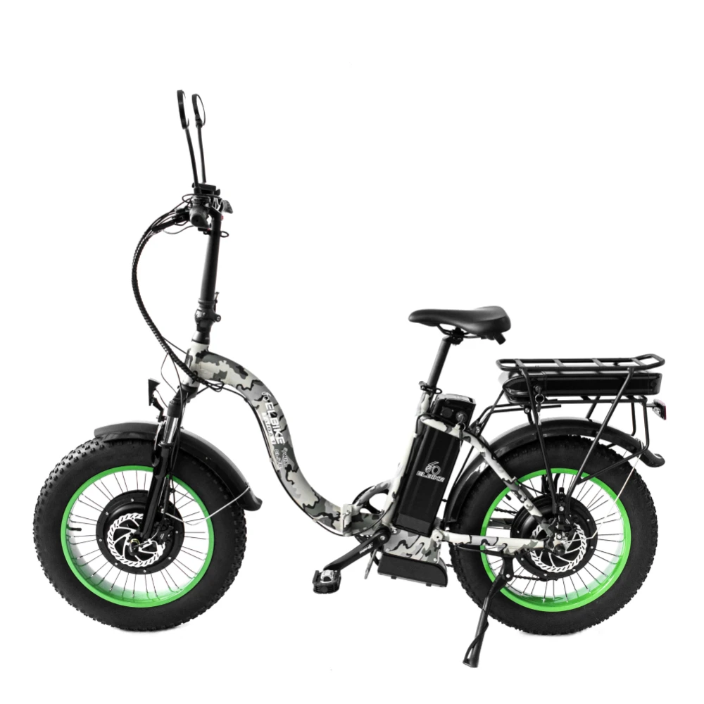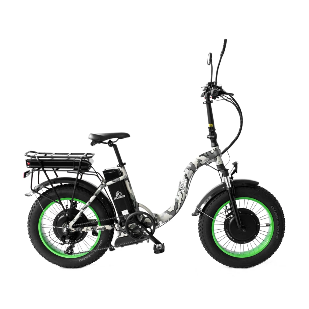 Электрофэтбайк Elbike TAIGA 1 Twix камуфляж предназначен для эксплуатации в черте города. Эстетически привлекательный байк лучшее предложение этого сезона. Технические характеристики гарантируют мощь и приличную скорость. Дополнительные элементы удобства - комфорт при езде на дальние расстояния. Купить модель по приемлемой цене предлагает наш интернет-магазин. Основная конструкция рамы изготовлена из инновационного алюминия. При массе 28 кг техника способна выдерживать грузоподъемность 130 кг. Технические характеристики электромотора – мощность в 1000 Вт и батарея емкостью 16 А*ч позволяют достичь приличных скоростей. Максимальные скоростные параметры составляют 45 км/час, пробег – 75 км в смешанном режиме – 110 км. Мощная колесная часть с широкими покрышками 20х4 обеспечивает отличный накат, гарантирует устойчивость и надежную сцепляемость с грунтом. Современный информационный дисплей позволяет держать под контролем параметры скорости, пробега и степени зарядки батареи. Наличие регулируемого анатомического седла превращает обычную продолжительную прогулку в удовольствие. Небольшой задний багажник облегчает процесс перевозки груза. Если вы ищете технику для ежедневной эксплуатации в пределах города, предлагаем обратить внимание именно на этот вариант.