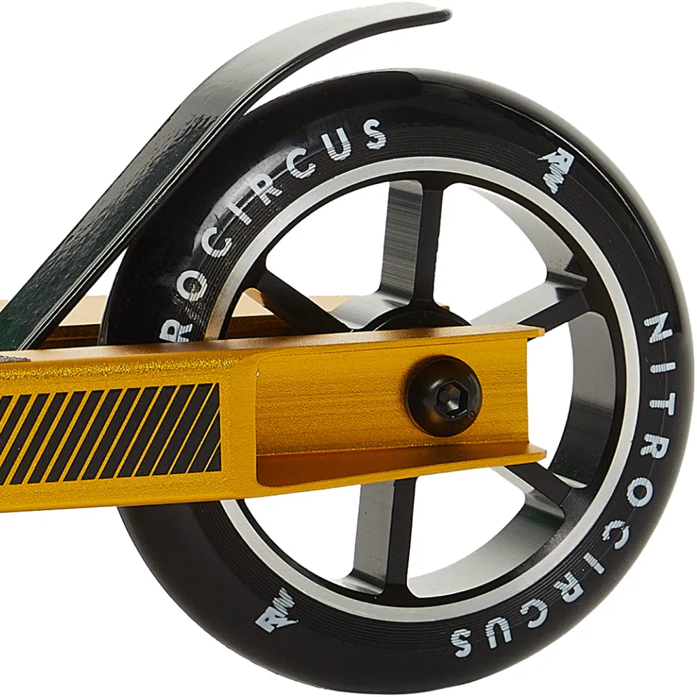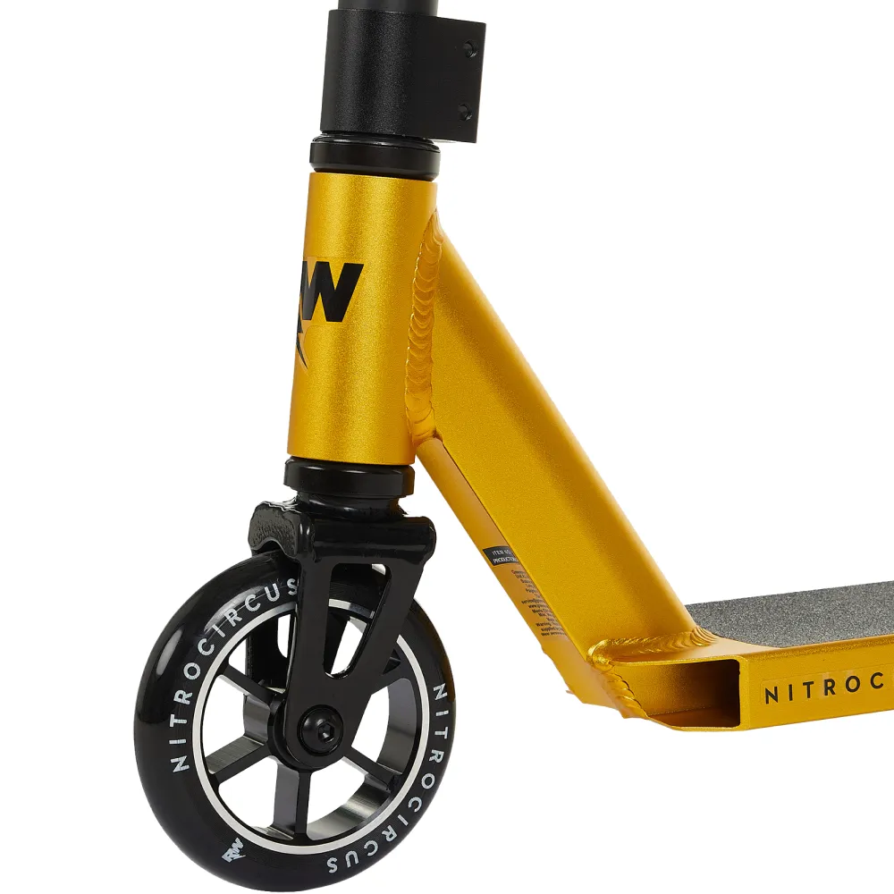 Трюковой самокат Nitro Circus Ryan Williams, 110 мм, черно-золотого цвета - модель, быстро завоевавшая популярность благодаря увеличенной грузоподъемности до 100 кг. Стильное оформление и утонченные формы на высоте, влюбляют и покоряют сразу, с первого взгляда. Самокат станет прекрасным подарком на любом мероприятии для мужчины и женщины, непостоянных подростков. Накатистые колеса 110 мм с подшипниками ABEC 7 обеспечивают быстрый разгон до максимальных показателей. Алюминиевая рама весом 3,35 кг позволяет хорошо маневрировать на городских улицах и при выполнении трюков. Наш интернет-магазин предлагает взаимовыгодное сотрудничество на равных условиях и специальную программу лояльности для постоянных покупателей.